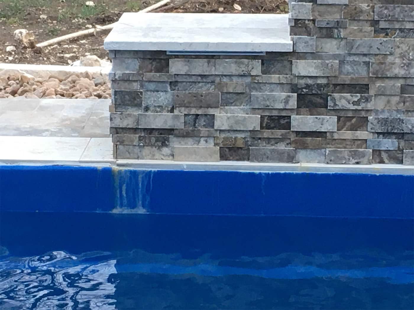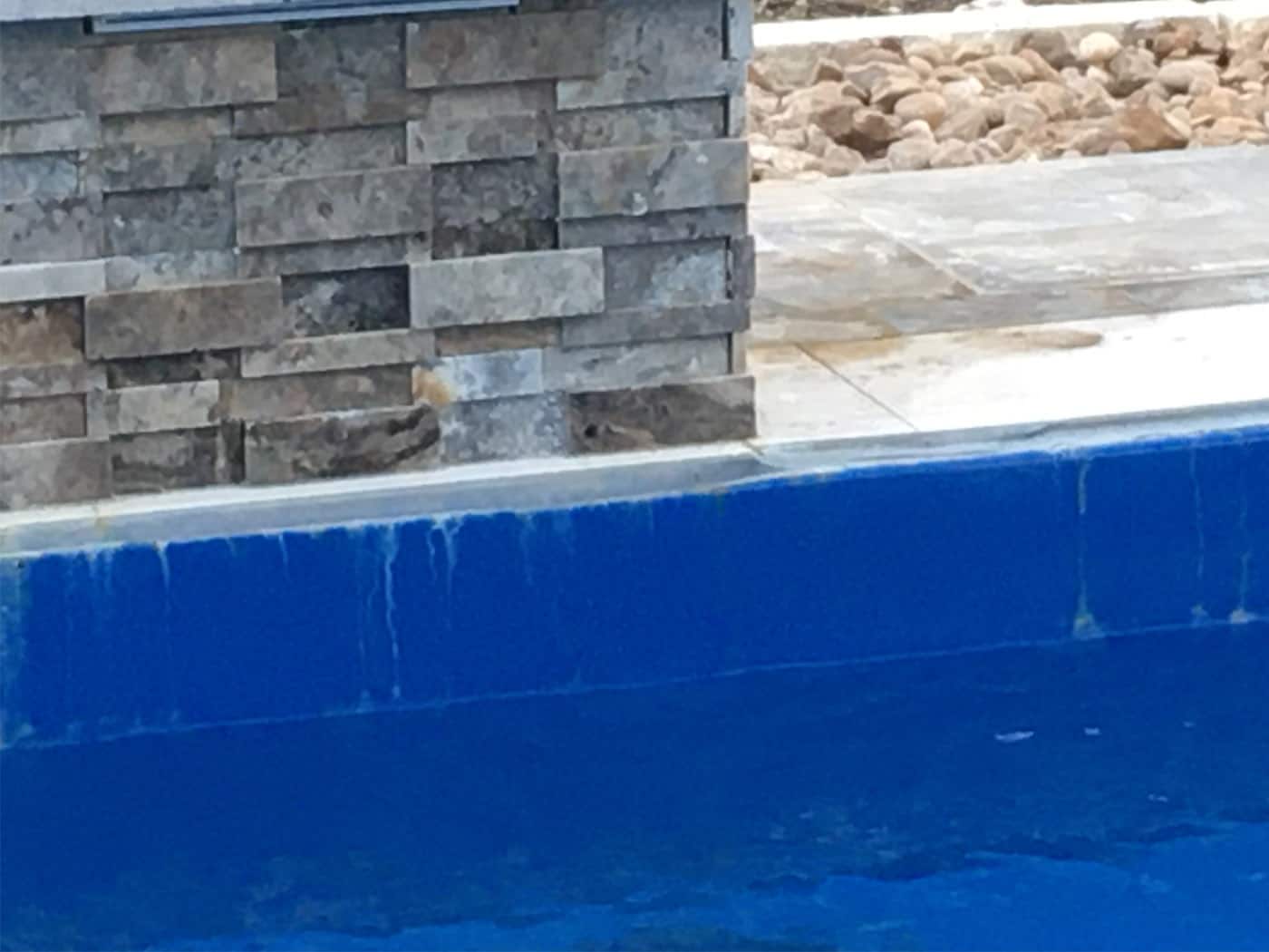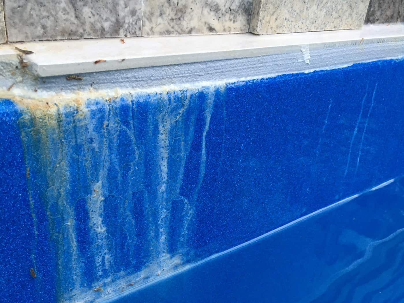There may be outside influences, beyond water chemistry, that may impact the cleanliness of your pool. One example is the use of mortar during installation of concrete and tiles on your pool. Water could splash into the mortar causing the concrete to “cry.” The “tears” that occur will be of calcium sliding down the sides of your pool walls. The photos below shows the build-up after only one week. To prevent this from becoming a major issue, it should be cleaned weekly. If left unattended, it could cause an accumulation that will eventually result in the pool needing to be sanded and refurbished – which is a major repair charge.